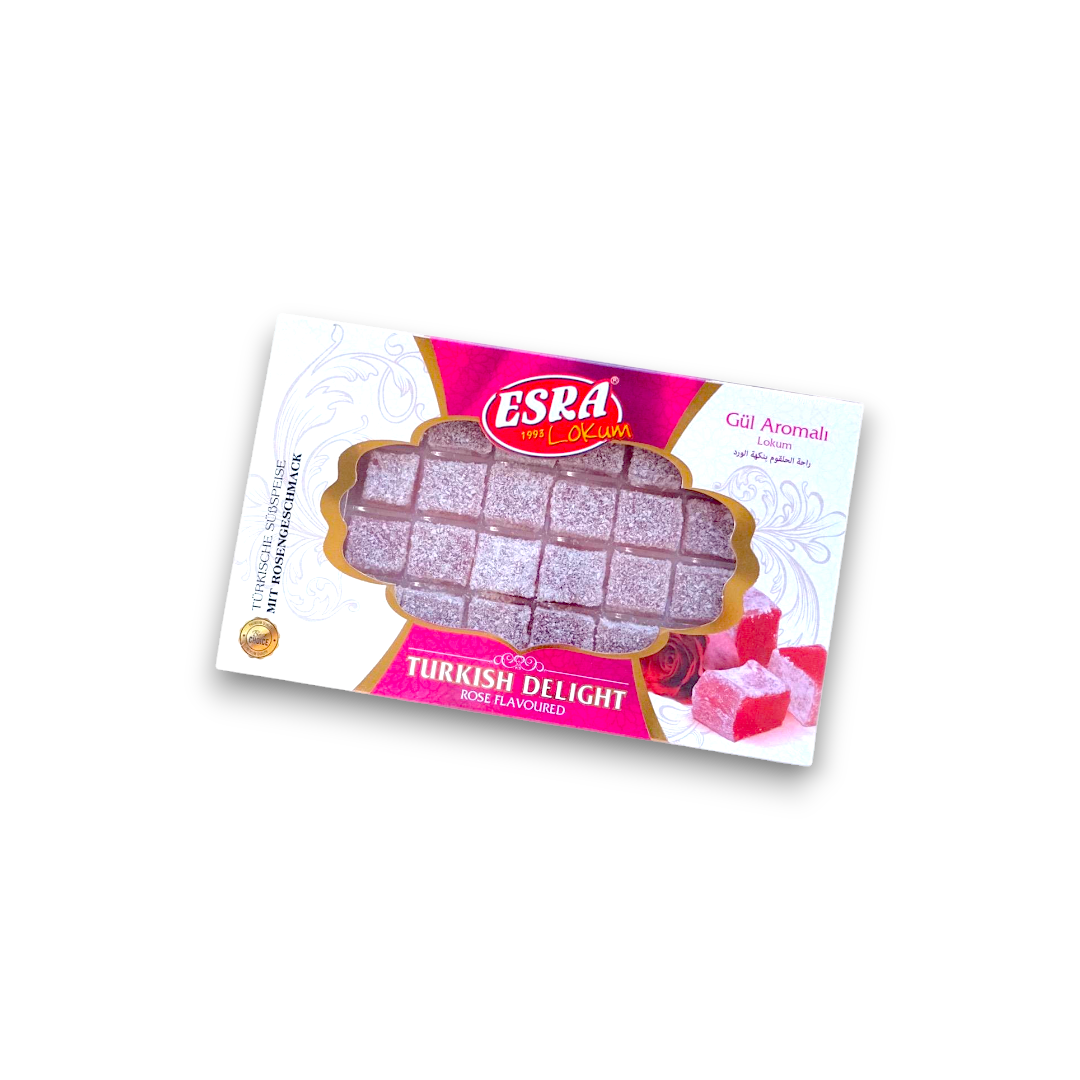 Esra Turkish Delight Rose Flavour (Gul Aromali) is a product that offers a delightful and unique taste experience. Its key features include a rich rose flavor, a soft and chewy texture, and a traditional Turkish recipe. The benefits of this product include its natural ingredients, gluten-free formulation, and its ability to satisfy sweet cravings. Its unique selling points are its authentic Turkish recipe and the exotic rose flavor that sets it apart from other confectionery options.