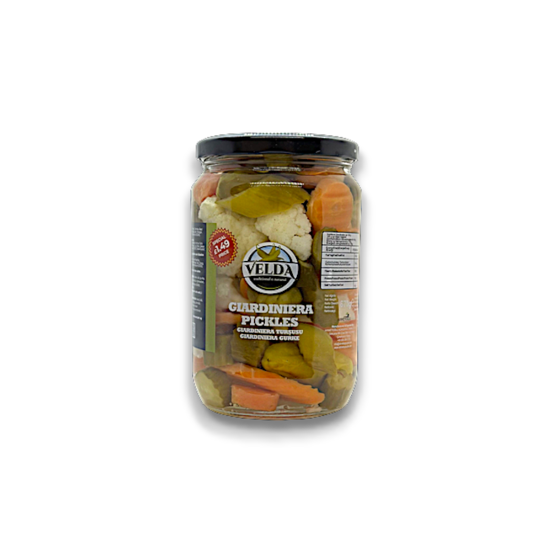 Velda Giardiniera Pickles are a unique and flavorful product that offers a blend of pickled vegetables, including cauliflower, carrots, peppers, and celery. These pickles are known for their tangy and crunchy texture, making them a perfect addition to sandwiches, salads, and antipasto platters. With their vibrant colors and zesty taste, Velda Giardiniera Pickles add a burst of flavor to any dish. Their versatility, high-quality ingredients, and traditional recipe make them a standout choice for pickle enthusiasts seeking a delicious and authentic experience.